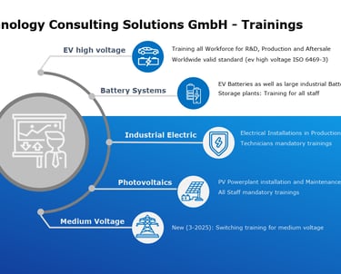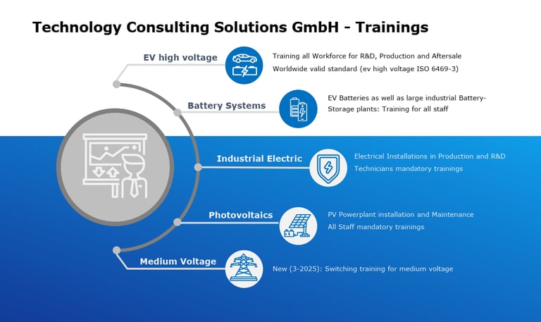 TCS provides industry-proven electrical training programs covering EV high-voltage systems, battery technologies, industrial electric installations, photovoltaics and medium-voltage operations. Our qualification pathways ensure that all personnel - from R&D to production and field service - meet internationally recognized safety and compliance standards and mandatory occupational safety requirements. With a strong focus on operational reliability, our courses deliver the technical competence required for safe installation, maintenance and fault-free operation of modern electrical and energy systems. This comprehensive training portfolio enables companies to achieve full Electrical Compliance Excellence across all business units.