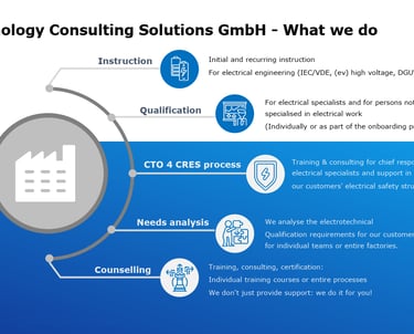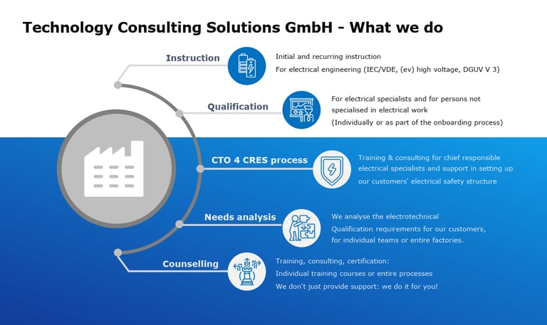TCS provides a comprehensive portfolio of electrical instruction, qualification and consulting services to ensure full compliance with IEC/VDE and DGUV standards. We deliver initial and recurring instruction as well as structured qualification programs for electrical specialists and non-electrical personnel, supporting both onboarding and ongoing competency development. Our dedicated CRES process enables companies to establish a robust electrical safety organization by training and advising Chief Responsible Electrical Specialists. In addition, we conduct detailed needs analyses to identify electrotechnical qualification requirements for individual teams or entire production sites. Through targeted training, consulting and certification services, we implement effective, compliant and industry-ready electrical safety processes for our customers.